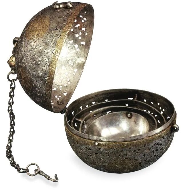 古代的香囊主要是用来熏香。熏香有两种:一种冷香,直接闻;一种是热香,需要点燃。这件香囊装的就是热香。这样的香囊利用了重心和平衡的原理,焚香时,无论怎么转动,香盂始终保持水平状态,热香不溢出。在唐代,宫内的嫔妃贵妇很多都会用这样的香囊,随身携带也可,放在被褥之中,挂在帷帐上也可。此外,香囊除了有实用价值,还可以作为定情信物。因为是随身戴的,就像玉佩一样,恋人之间常常用它表达情意。