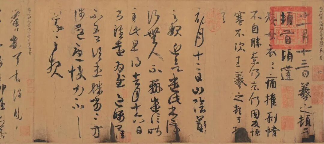 据说,《万岁通天帖》中的第一幅和第二幅是王羲之本人所写。第一幅《姨母帖》是姨母去世后,他写信问候姨母家人,字体庄严,其中的“痛”字尤其生动地表达了他的悲痛心情第二幅《初月帖》看上去则轻松潇洒。历史上,《万岁通天帖》遭遇过两次火灾,一次在明代,一次在清代,虽得以幸存下来,却也留下了无法修复的火烧痕迹。它的命运更是跌宕起伏。