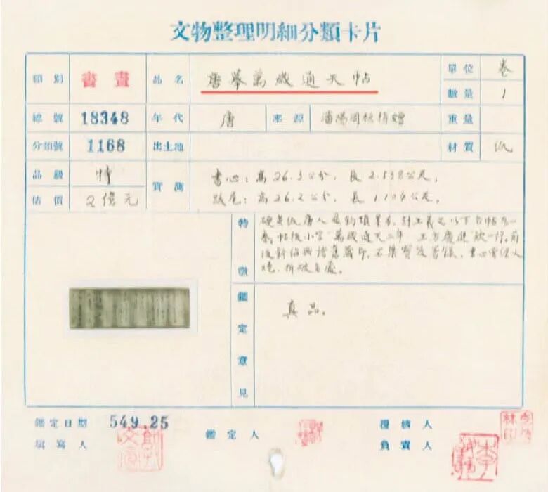 这一年,《万岁通天帖》的“文物整理明细分类卡片”上的印章落款是杨仁恺。他当时是东北博物馆的研究员。1983年6月,文化部文物局成立中国古代书画鉴定组,入选的书画鉴定大师平均年龄超过六十六岁,个个技艺精湛,其中包括谢稚柳、启功、徐邦达、杨仁恺、刘久庵、傅熹年、谢辰生等。