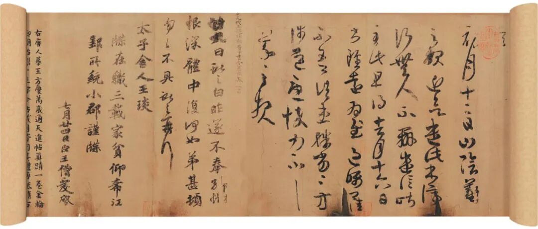 这卷摹本,包括王羲之、王荟、王慈每人两帖,王徽之、王献之、王僧虔、王志每人一帖。卷尾有王方庆题记。宋代岳珂在《宝真斋法书赞》中称这残存的七人十帖连尾款的一卷为《万岁通天帖》,所以得名。