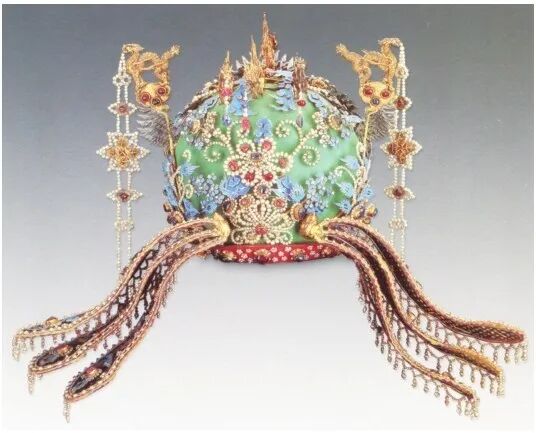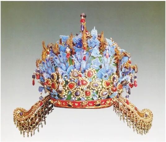 但后来,人们又在她的棺椁旁发现了大量珍贵的随葬品。三龙二凤冠,就来自她棺樟南侧的第十四随葬品箱中。它总共镶嵌淡黄色刚玉2颗,蓝宝石 33 颗,红宝石59颗,还串缀了珍珠3426颗。万历年间,有位文人叫陈汝镝创作过本《甘露园短书》,记载了万历二十七年各类宝石的价格。红、蓝宝石和黄色刚玉为八十两白银一分。珍珠的价格为二十五两白银两分。八十两白银在当时能买什么呢? 一分重量的刚玉类宝石可以买上一万斤大米。这样看,这个凤冠真的是价值连城!而且它的制作工艺除了用传统的镶嵌、累丝,还用了点翠,这在当时非常珍贵。