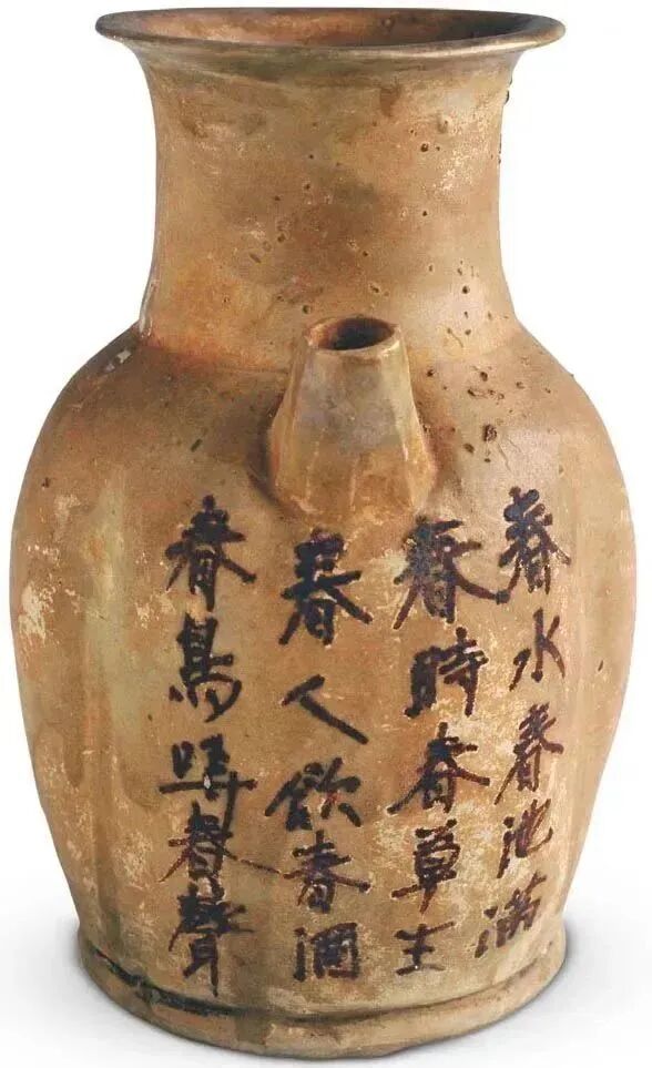 长沙窑还打破陶瓷的素净传统,创烧出釉下多彩,呈现出褐色、绿色、红色、蓝色等色彩缤纷的陶器。诗句、色彩和画作,终于让长沙窑逆风翻盘。开头说的那件长沙窑青釉褐彩诗文执壶,通高19厘米,口径9.2厘米,底径10厘米,1983年出土于湖南长沙窑窑址,平底,喇叭口,瓜棱腹,背部有一执手,多棱短流,流下就是那首都是“春”的五言诗。这青釉褐彩诗文执壶,现藏于湖南省博物馆,堪称国宝。
