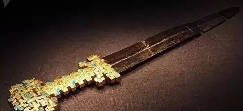 金质的剑柄作镂空蟠螭纹和饕餮纹,镶嵌绿松石和料珠,其雕刻技术,镶嵌工艺让人叹为观止,人们称这把宝剑为“秦剑之星”,但这把宝剑最珍贵之处不在剑柄,而在于剑刃材质是铁!