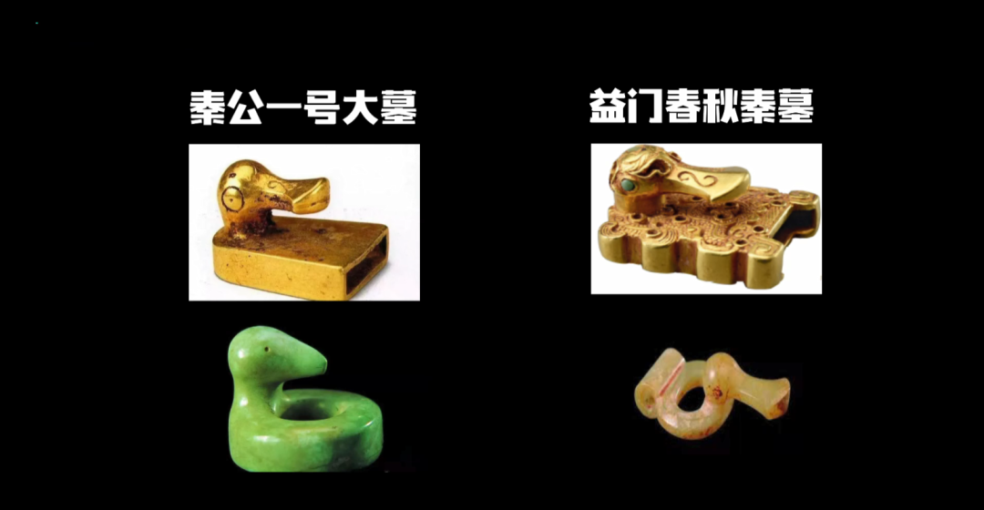 而且更令人震惊的是,这些文物经过比对,和秦景公墓穴中的文物及其类似,甚至金圆泡,金串珠,鸭首金带扣和鸟首形玉带钩等能和秦景公的随葬品配成对!