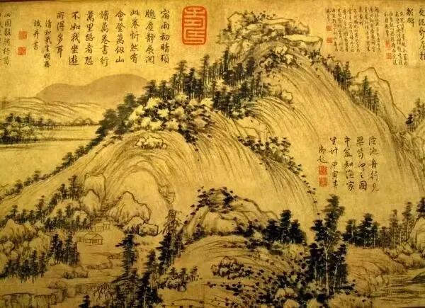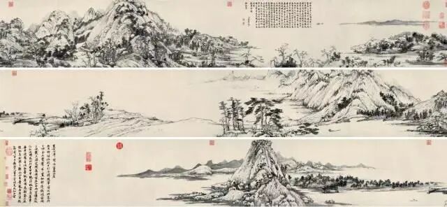 《富春山居图》上,一峰一状,一树一态,“雄秀苍莽,变化极矣”。此后的画家,都把亲眼见到它当成天大的荣耀。黄公望在画卷完毕题跋后就送给无用,随后几百年经过了很多人,画上有沈周、文彭、王稀登、周天球、邹之麟、金士松、董其昌题跋,还有沈德潜跋,金士松奉勃补书、乾隆御识,臣梁诗正奉敕敬书。