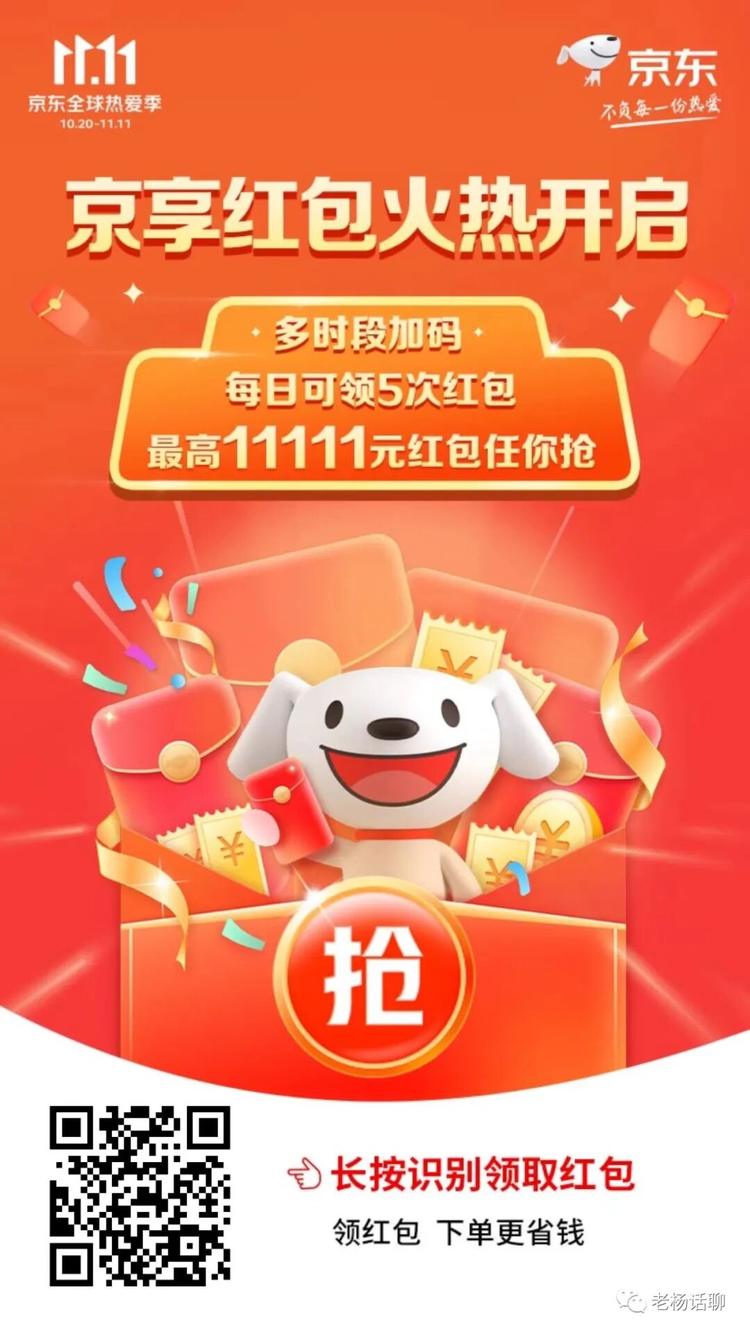 京东双十一活动已经开始了,上面就是著名的京享红包,每天都可以领三次,最高可以领到1111元,红包会自动存入你的京东账户,可以直接当现金抵扣买任何京东商城的产品。如果你准备在双十一买点好东西,就加微:pk322073,老杨拉你入群,独家献上京东双十一攻略。