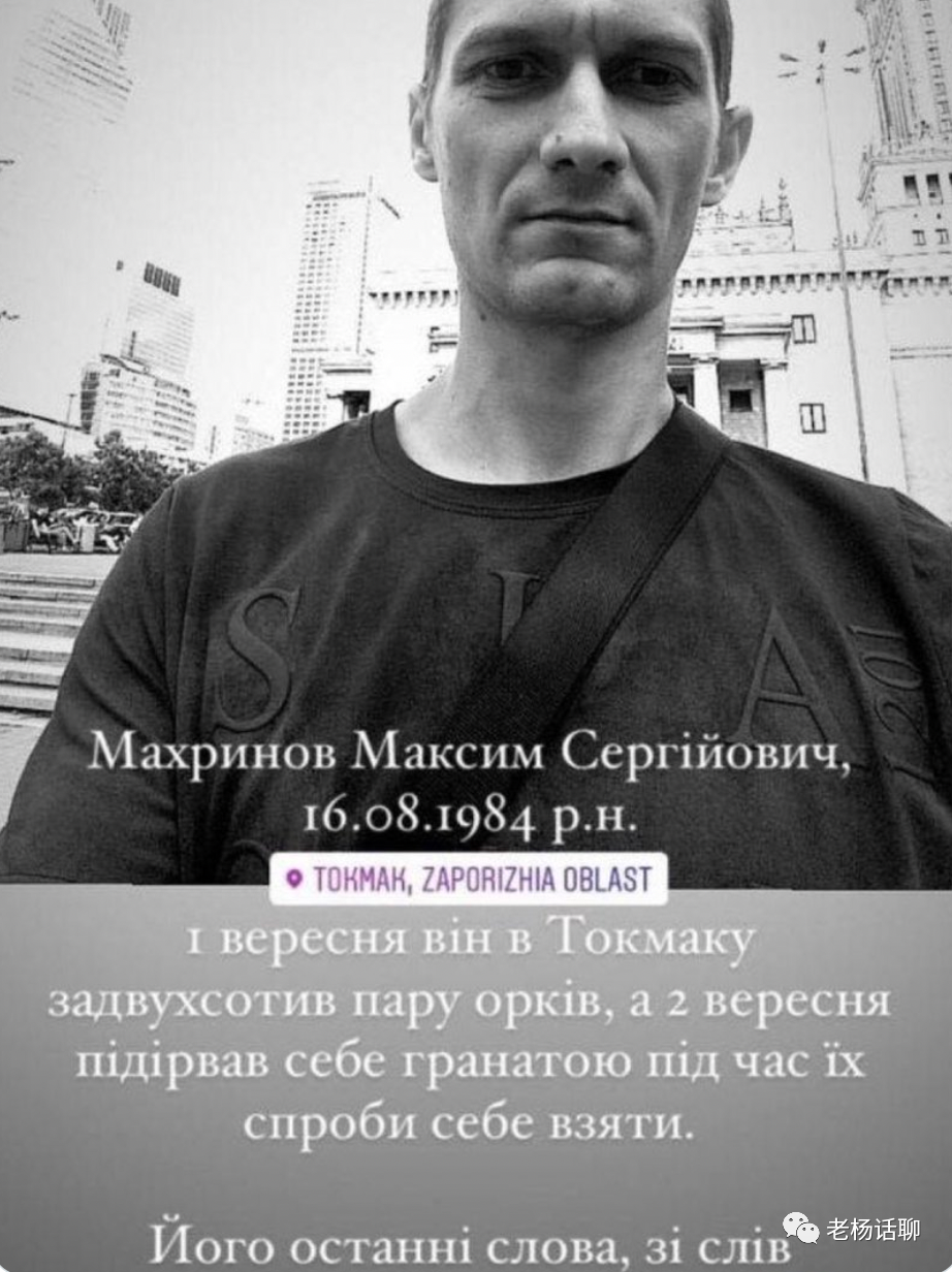 乌克兰游击队员马克西姆·马赫里诺夫在扎波罗热州托克马克被俄罗斯国民警卫队逮捕时用手榴弹引爆了自己。