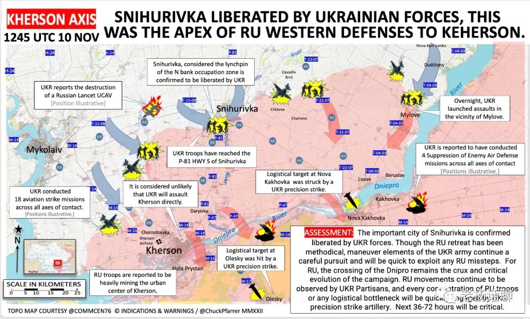 更多的定居点已经被乌军收复。不知道能不能真的撤退到第聂伯河左岸去,但是起码是在大幅度收缩了。