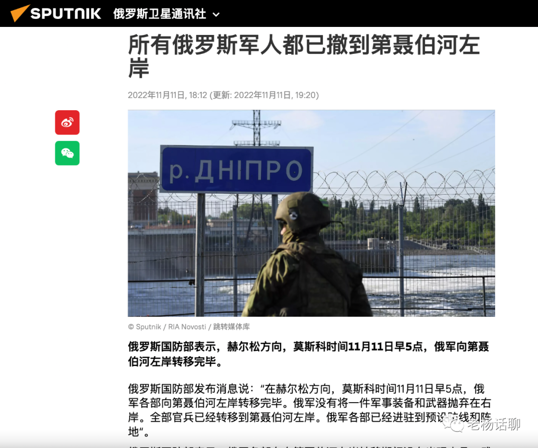 “在赫尔松方向,莫斯科时间11月11日早5点,俄军各部向第聂伯河左岸转移完毕。俄军没有将一件军事装备和武器抛弃在右岸。全部官兵已经转移到第聂伯河左岸。俄军各部已经进驻到预设防线和阵地“。