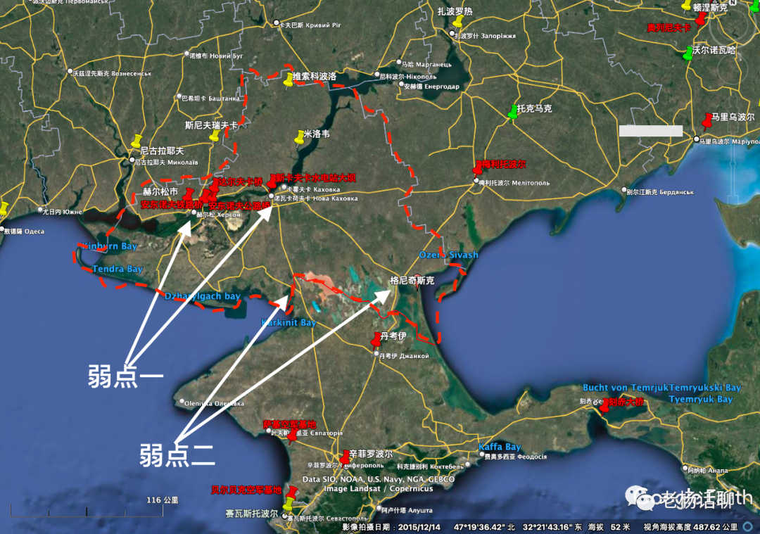 其实同样的,赫尔松州南部,到克里米亚之间,也只能通过两处桥梁来输送资源,就是图中弱点二的地方。