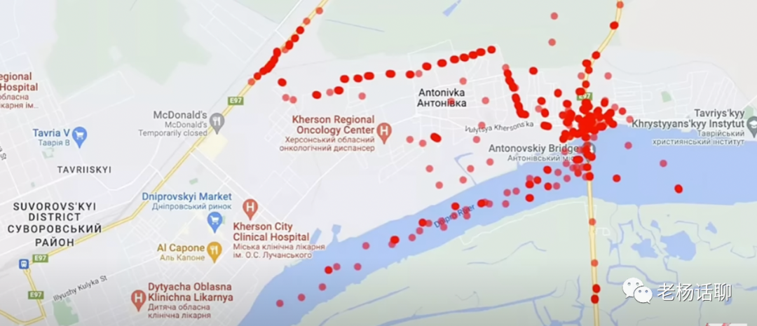 下面这张图,是这两天在网络上广泛流传的一张图,这是第聂伯河赫尔松这一段的手机信号来源的点阵图: