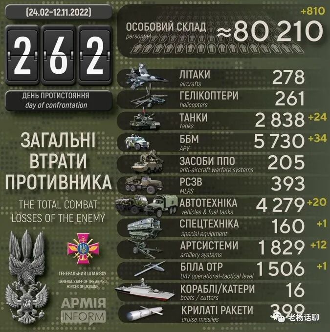 到11月5日早上6:00为止,乌克兰军方公布的俄军伤亡损失如下: