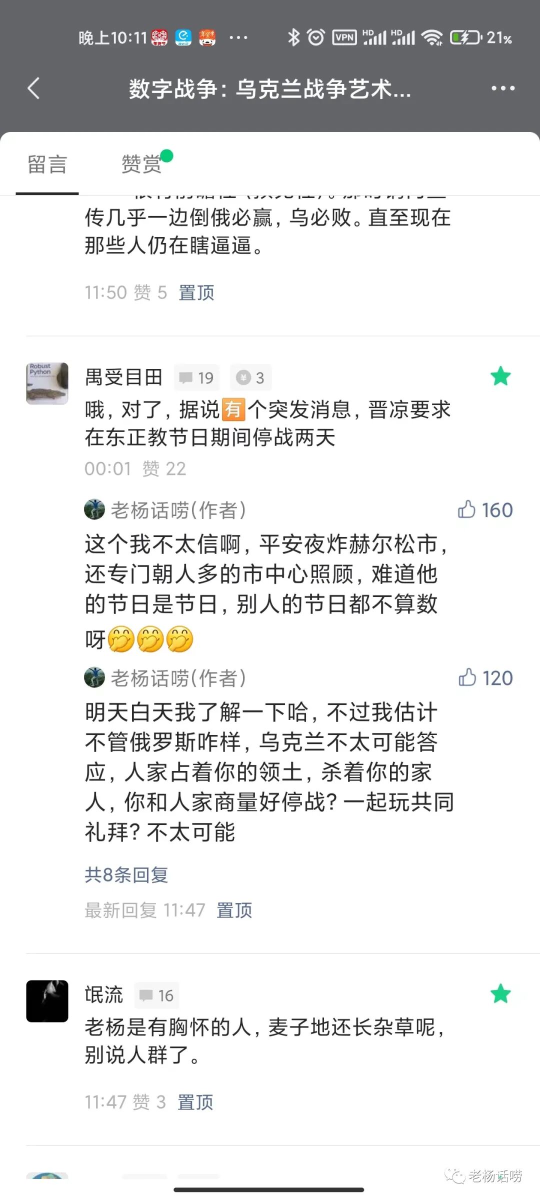 作者:这是昨日在老杨话唠发出的当日文章,先修改后在本号发出,如果您还没有关注《老杨话唠》,可以打开下面的公众号关注老杨的每日俄乌战评文章:
