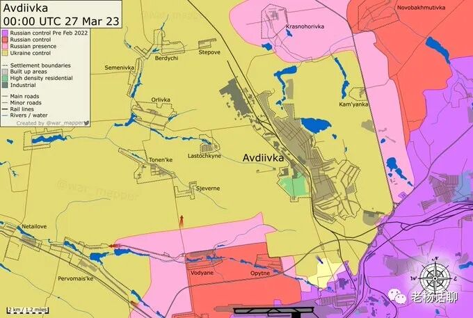 23/3/27. 阿夫迪夫卡战况,乌军在该城区域以南发起反攻,成功收复斯帕尔塔克(Spartak)区域,该区被俄军控制的阵地和壕沟(浅黄部份),距离顿涅茨克机场约2公里,同时也是通往顿涅茨克市的门户