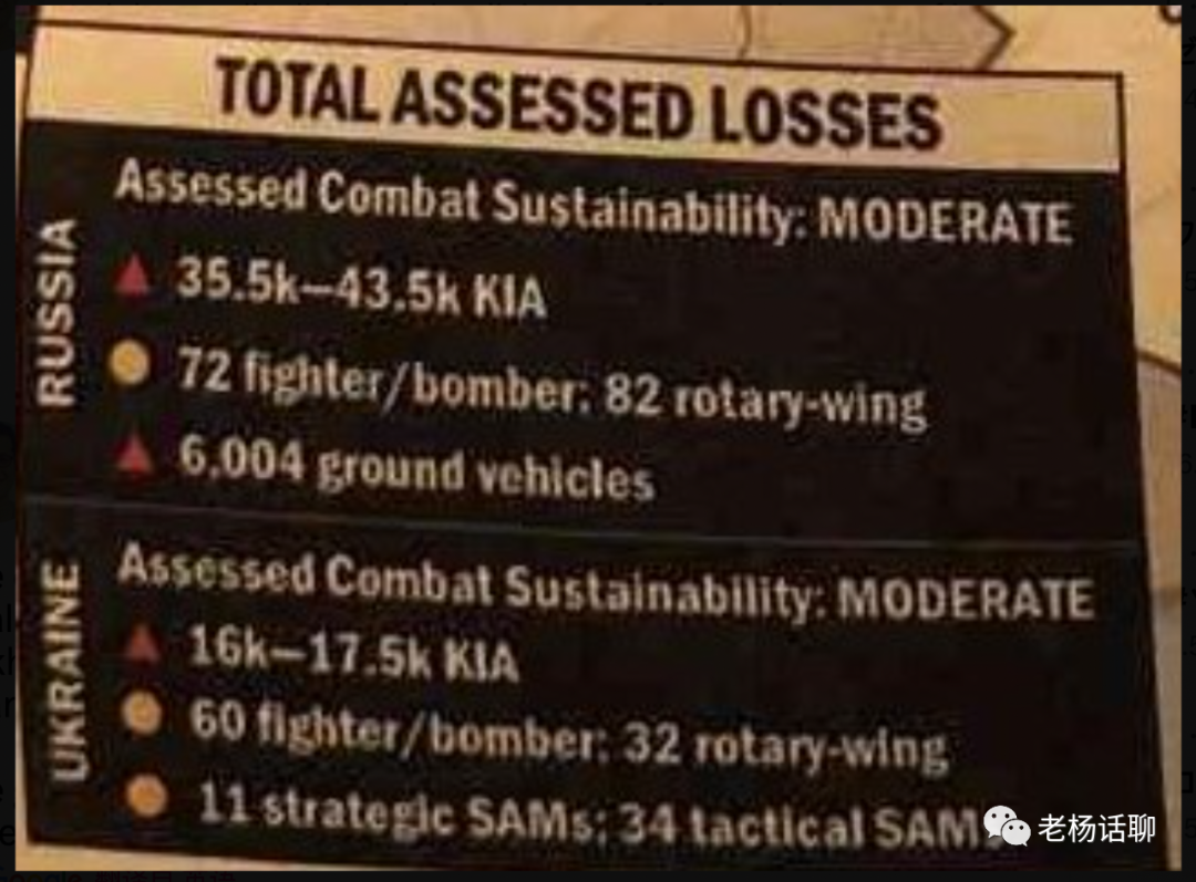 例如,其中一张幻灯片称已有16,000到17,500名俄罗斯士兵阵亡,而乌克兰则有高达71,500名部队阵亡。五角大楼和其他分析师估计,俄罗斯的伤亡人数远远超过这个数字,接近20万人死伤,而乌克兰已有超过10万人死伤。