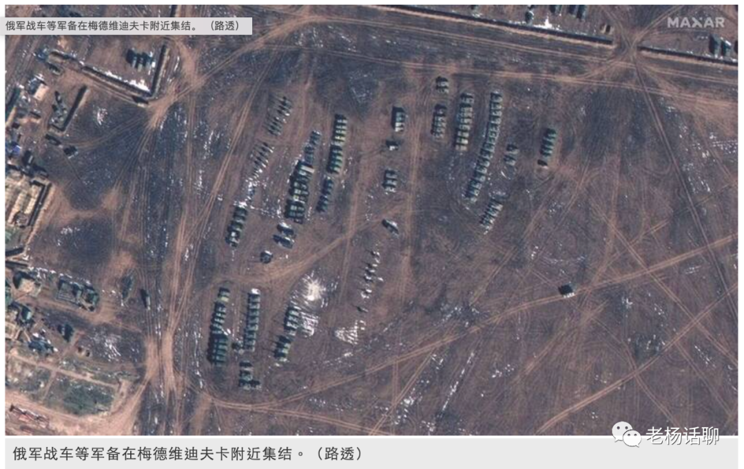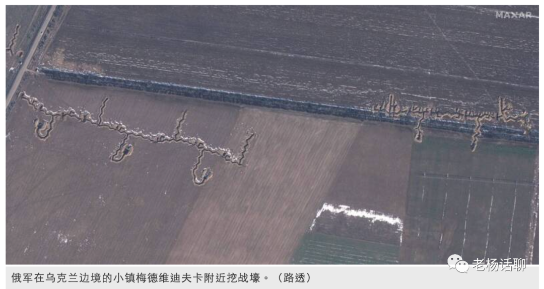 Maxar Technologies 的卫星照片显示,在克里米亚与乌克兰边境的小镇梅德维迪夫卡(Medvedivka)附近挖出战壕与其他防御工事构成的复杂防御网路,显示俄罗斯担心乌克兰会从该地发动攻击。