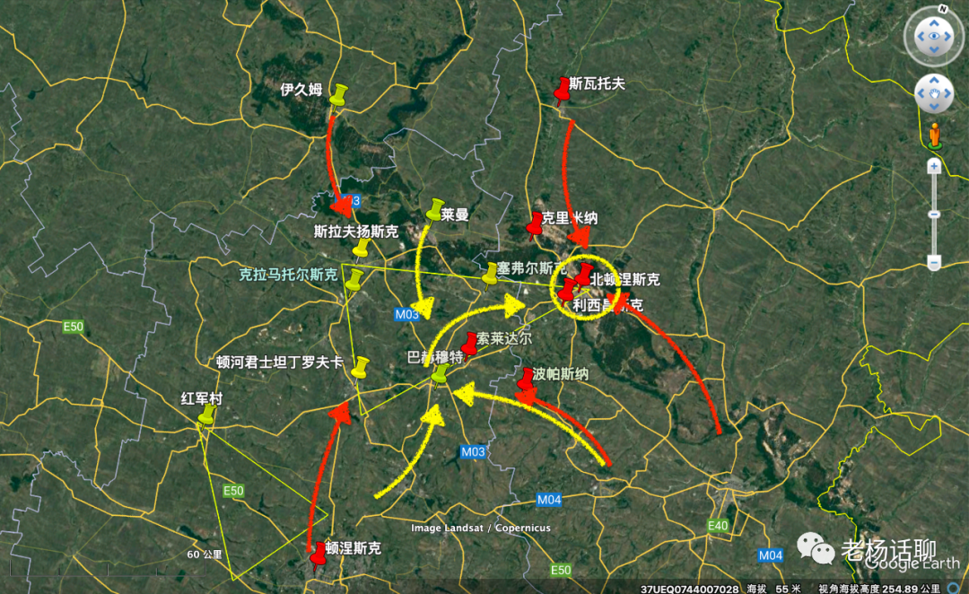 就是,利用北面的莱曼,和南面的巴赫穆特,形成一个南北对进的钳形攻势,目的就是夺取顿巴斯地区最东面的双子城,北顿涅斯克和利西昌斯克。