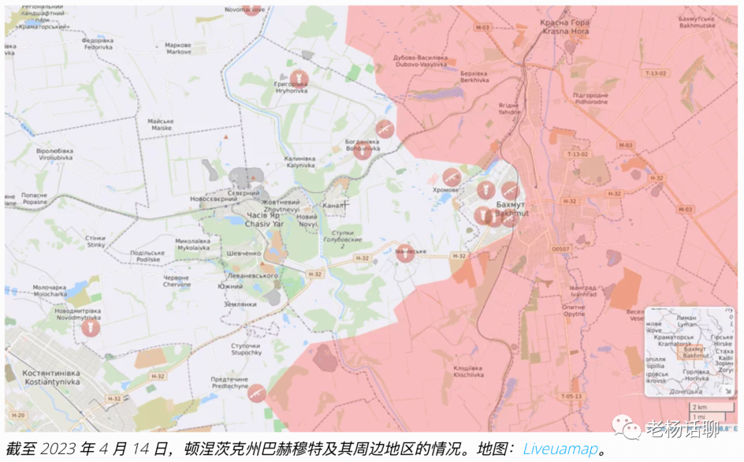 下面这张图,就是到4月14日为止,俄乌双方在巴赫穆特攻防战中的战线图: