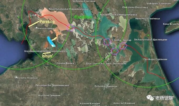 除了在Perekop和Ishun’的壕沟外,俄罗斯人还必须控制穿过Syvash泻湖的桥梁和水坝(上图中的紫色五边形),