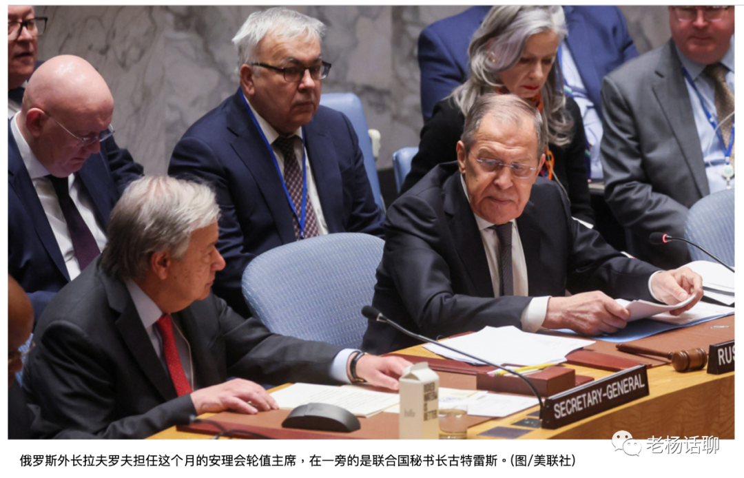 本月联合国安理会轮值主席是俄罗斯,俄罗斯外长拉夫罗夫在安理会主持会议时说:之所以俄罗斯会对乌克兰发起特别军事行动,原因在于消除北约多年来对俄罗斯的“安全威胁”。