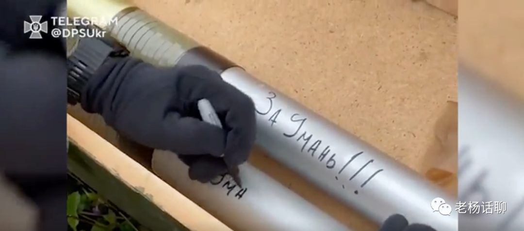 年轻的士兵,在火箭弹上写着“为了乌曼!”(За Умань! ),