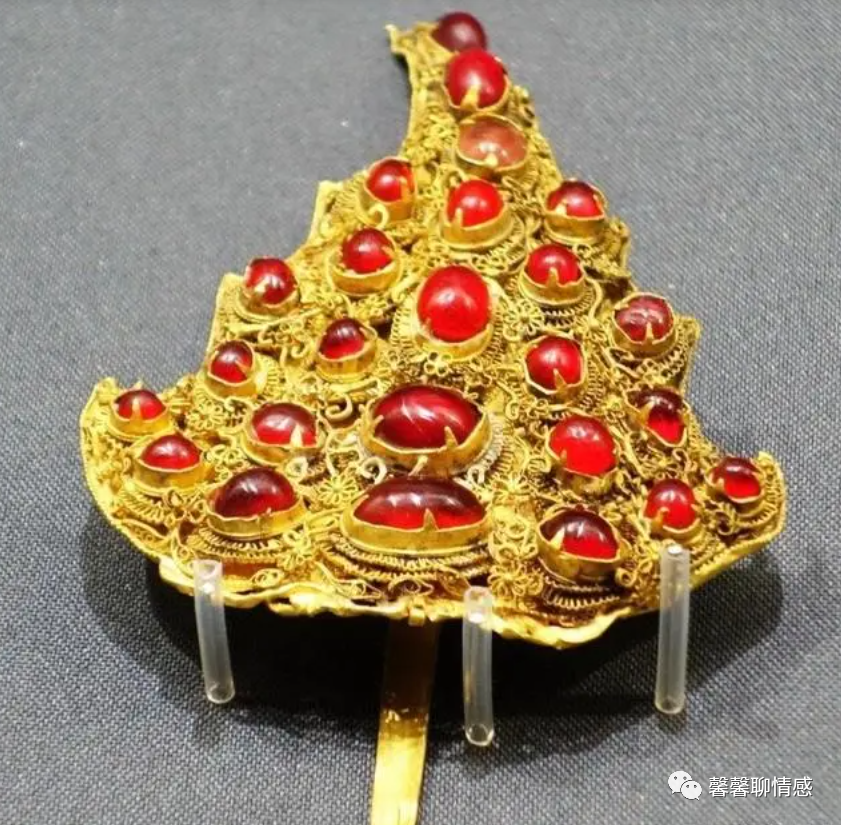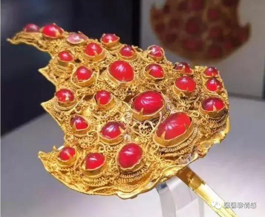 这个宝物是一个镶满红宝石的金簪,一共有25颗发着红光的宝石,红宝石底部用金托托住,周边是金丝花纹,整个就是一个金叶子的形状,躺在盒子里面闪闪发光。