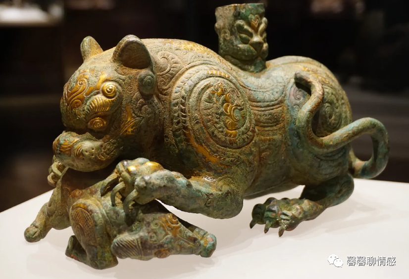 并且老虎身上还存有部分鎏金的痕迹,在青铜器时期鎏金技术还不是非常的发达,现存的发现的鎏金青铜器少之又少,可想而知,这件物品是相当富有的人才能拥有。