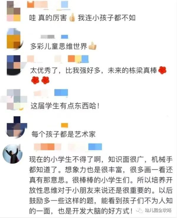 孩子一次开放性的考试,让很多家长见识了他们天马行空的想象力,甚至很多家长都投来羡慕的目光,说他们都是可塑之才。