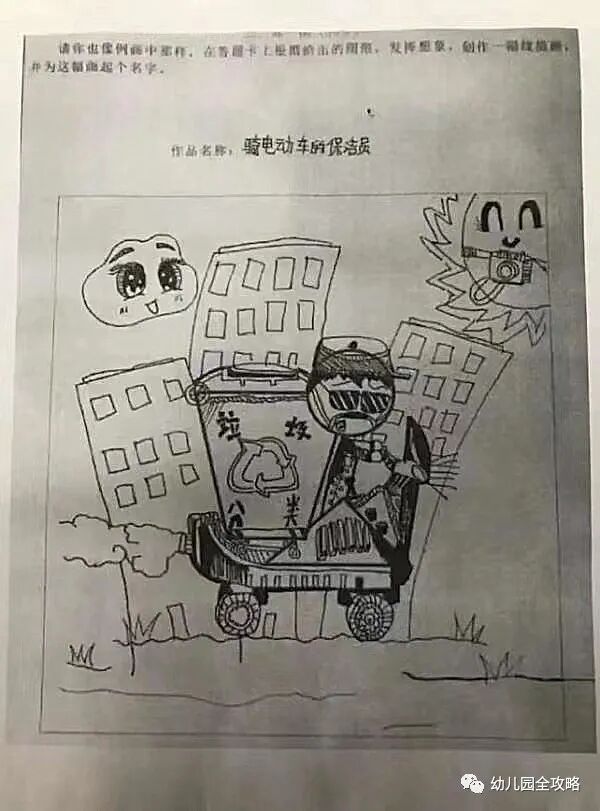 孩子的想象力真的是无穷无尽的。三角形的小汽车,圆形的人物头部,梯形的垃圾桶相得益彰。