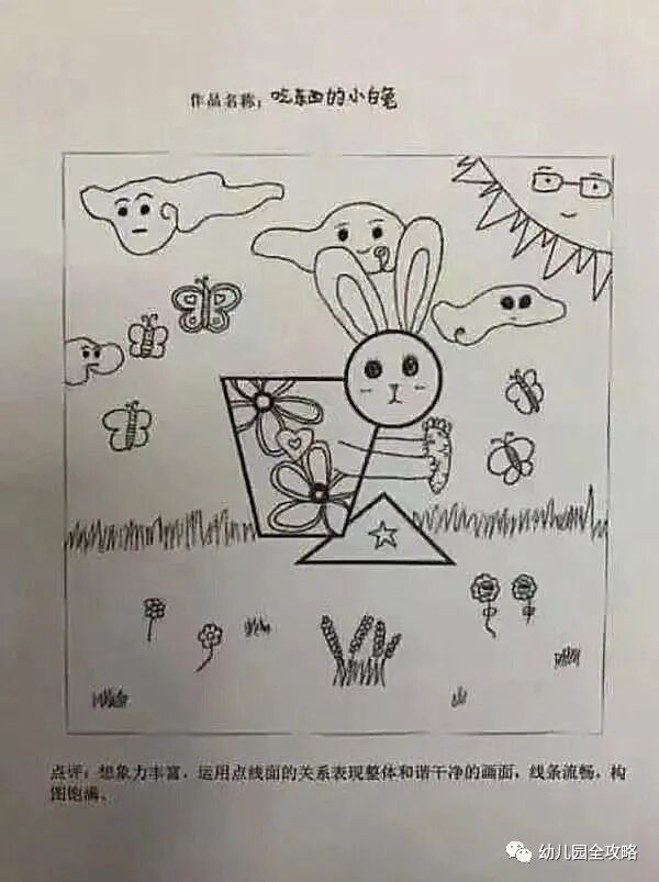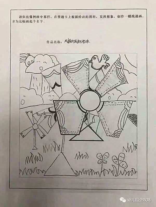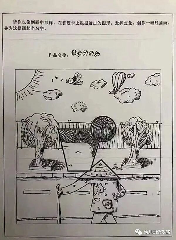 这其实是一道开放性的试题。就是让孩子们利用最常见的圆形、三角形、梯形进行创意作画,并且为自己的作品取一个好听的名字。