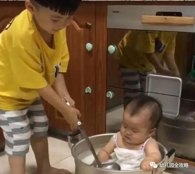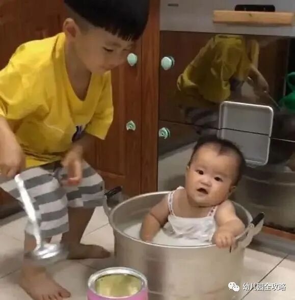 小弟弟倒觉得锅里有水十分好玩,一点也没有抗拒哥哥的捣蛋行为,甚至在锅里表现得很好奇。