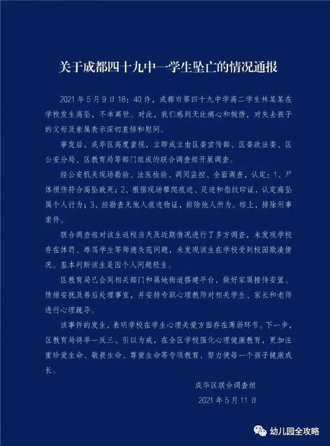 5月9日,一位妈妈失去了她一生中最好的“礼物”,她读高二的儿子。成都49中事件早上公布了学生坠亡的情况通报!排除了刑事案件,基本判断学生是因个人问题轻生。