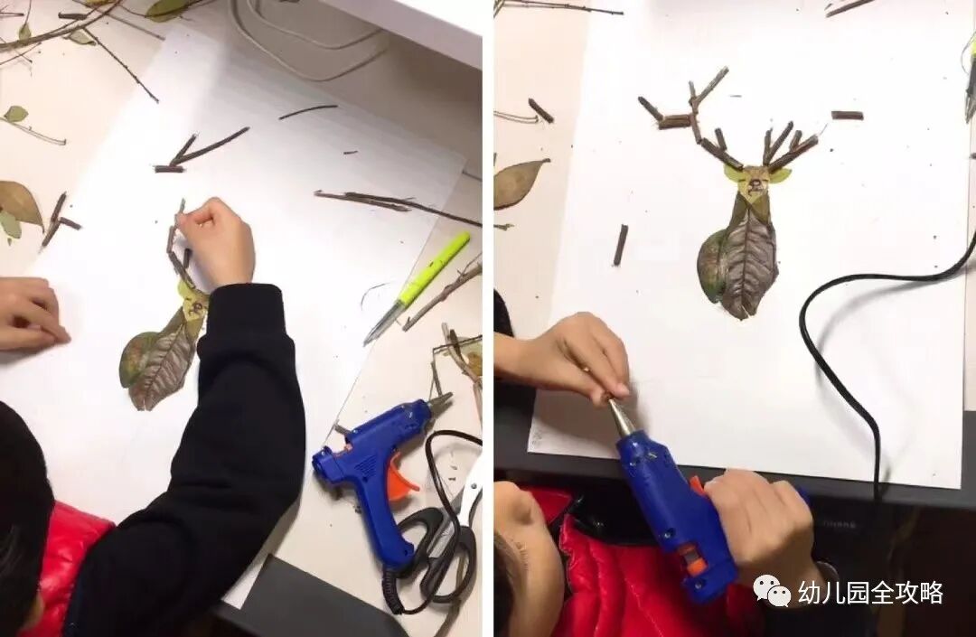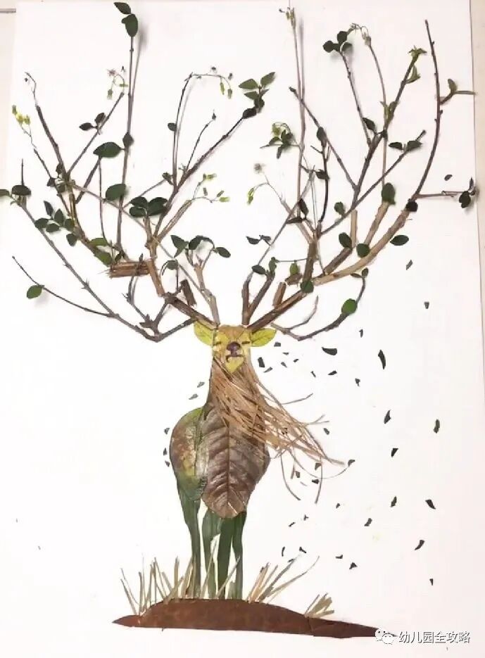 最后咱看一个不敷衍的小学生精致的美术手工作品吧,巧妙运用不同颜色的树叶和树枝进行构建麋鹿,创意满分。