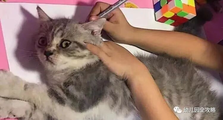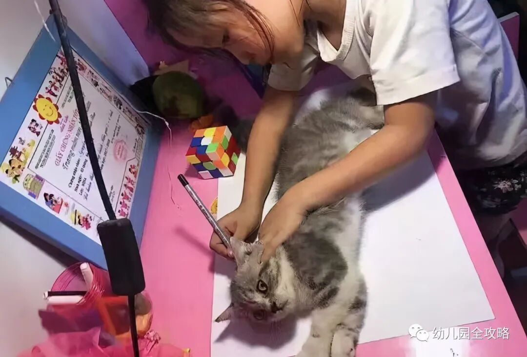 说干就干,直接把猫抓过来,按在画纸上,就开始完成自己的作业了,不知道会不会出现神作呢?那可说不准咯。