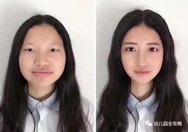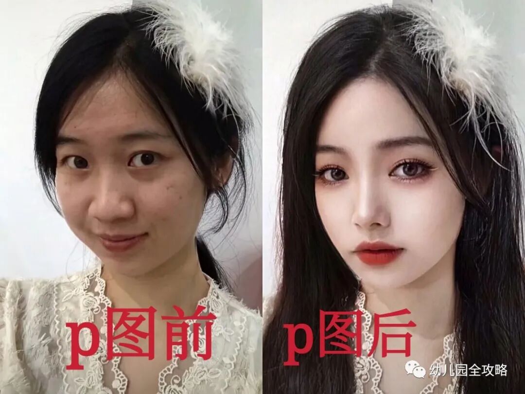 P图之后,这就成为冰山女神了,嘴唇变薄了,眼睛变大了,主要是脸型都变了,如果说两张脸都是瓜子脸的话,后者是葵花籽,前者就更多的是南瓜籽(单纯对比,无意人身攻击)。前后对比还真的不叫明显了,叫自己妈妈都不认识了。