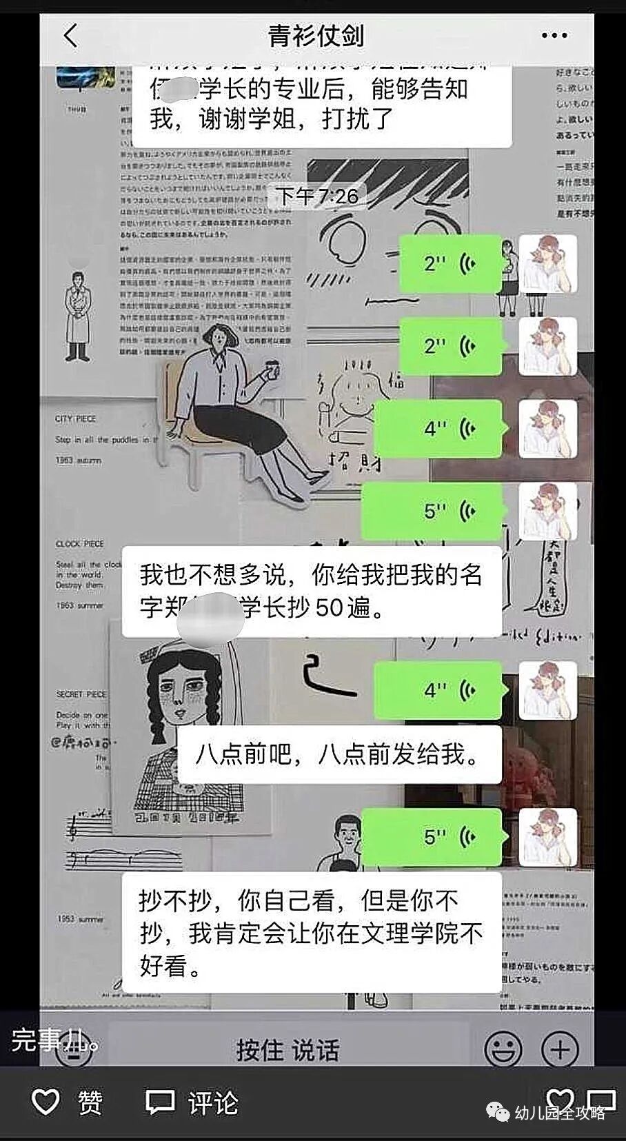 这是啥?活脱脱的就是小学老师罚抄我们写字的场景的情景再现啊。而且对于学弟什么时候抄完也做出了时间规定,八点之前抄完,而他们的聊天时间显示这个时候已经是七点半左右了,意思就是半个小时的时间抄完50遍。