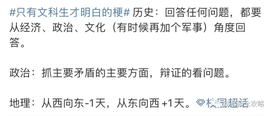 看到答案可能大家都会这么说,但是呢!如果没有看到答案的话,你们会想到答案是这样的吗?肯定想不到吧?这就是文科当中专属梗了,不怕你不回答,就怕你不敢想。