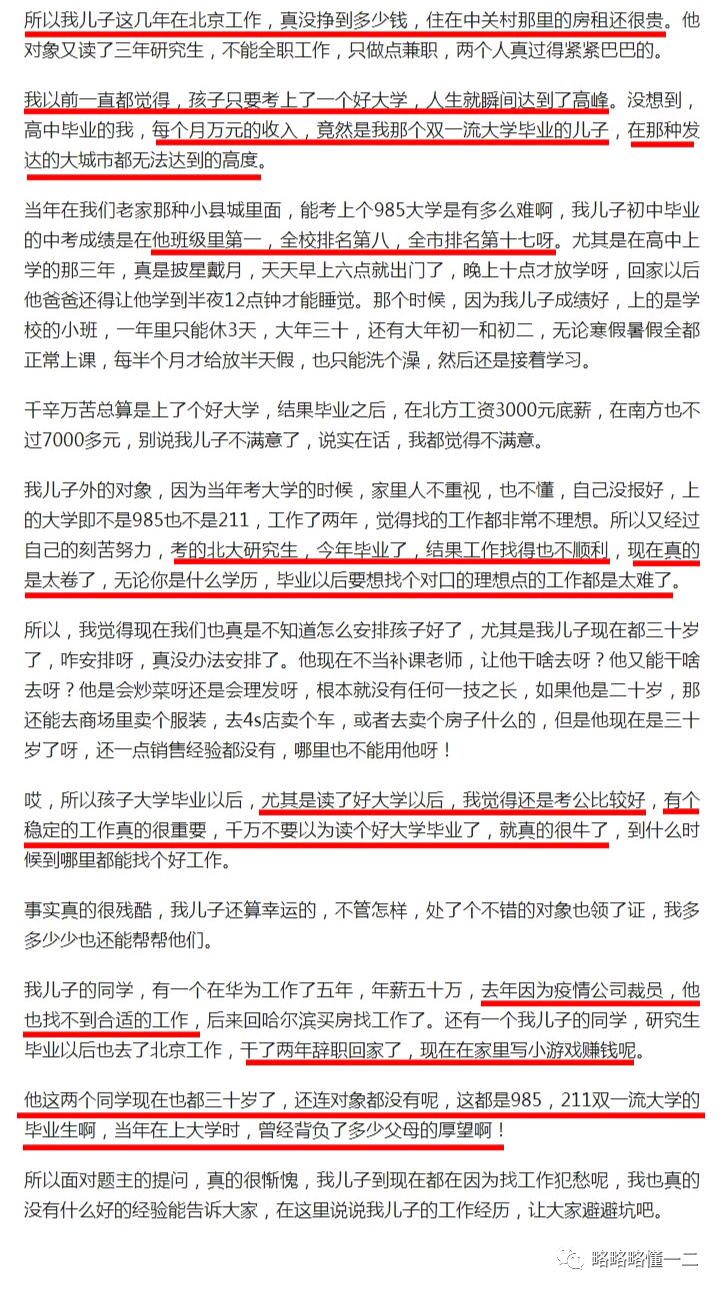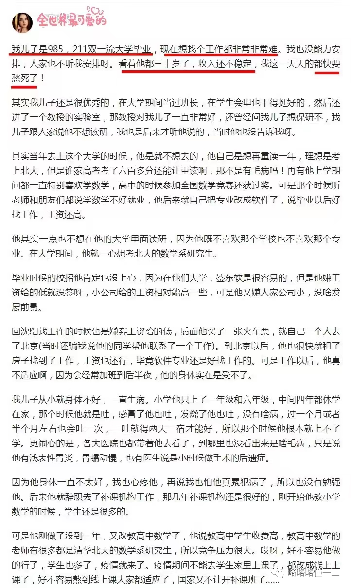 可今天要说的这位母亲的分享却恰恰相反,她说自己的儿子是985双一流大学毕业的学生,可三十多岁了都没找到稳定的工作,让他愁苦不堪。