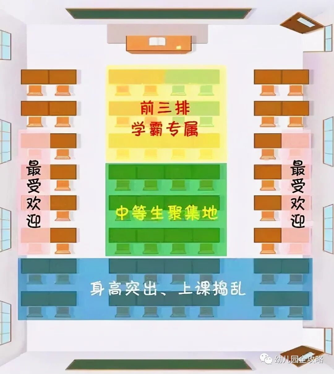 这样的座位,老师的关注多,上课听讲听得清楚,视线也好也不会造成近视。