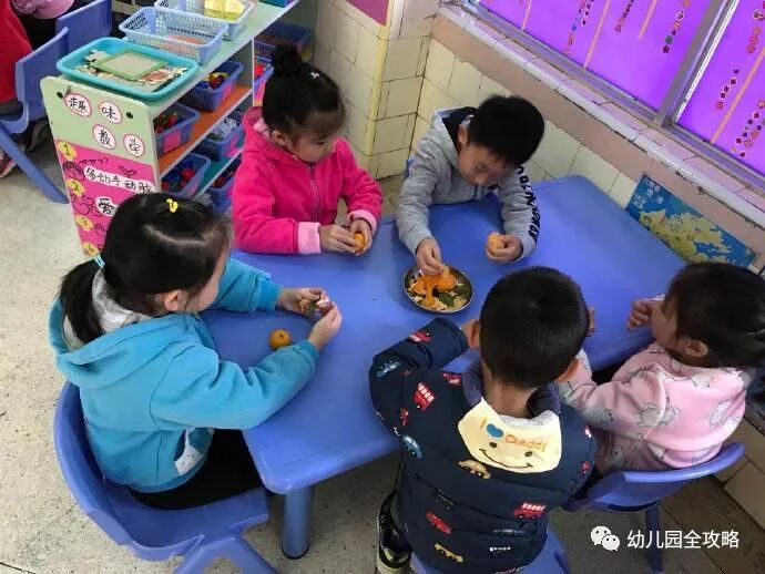 然后还有重要的点心环节,孩子和老人一样要少吃多餐。她们的用餐间隔时间是3个半小时,因此上下午都各有一次点心。品质好的幼儿园,点心可以是水果、糕点、糖水、或粥类搭配。差劲的幼儿园,略略也见过,顿顿都是四分之一的苹果分给孩子,还不能多要一块。