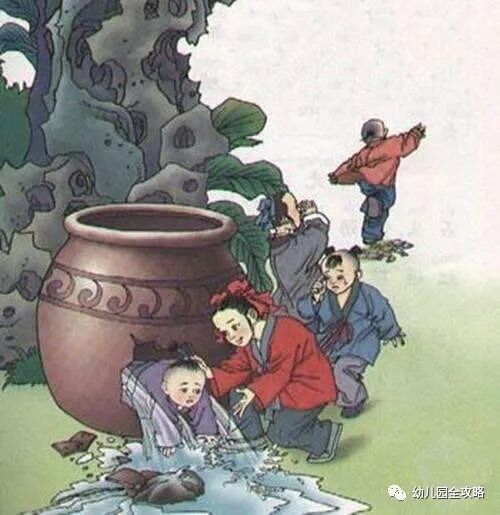 一群熊孩子在玩,一个熊孩子掉进大水缸。别的熊孩子都跑了,司马光不一样,急中生智,捡起大石头砸破了缸,玩伴得救了。