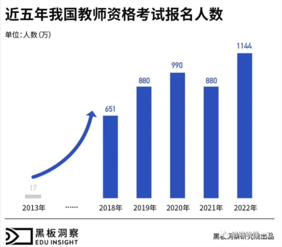 2022年的教资报考人数在10年翻66倍,1144.2万人次。