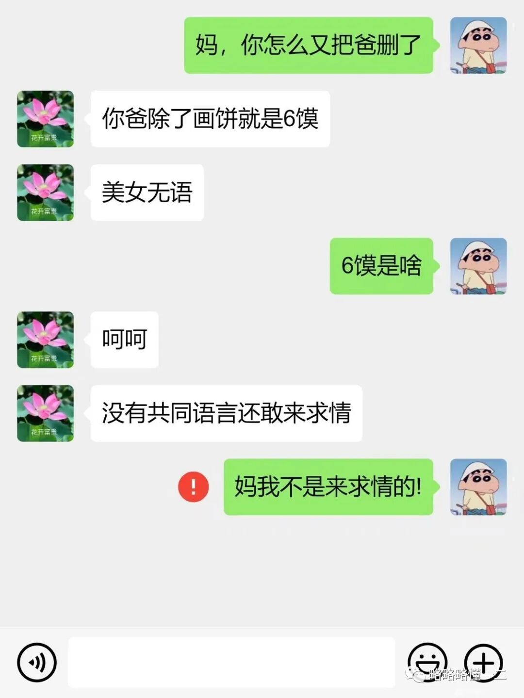 看看,看看,妈妈那是把网络用语玩的一套一套的,《美女无语》、《画饼》、《6膜》、《没有共同语言》、《拉黑》,这一系列的操作真的是我慈祥的母亲吗?
