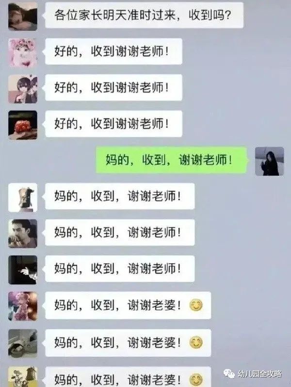 前面的家长都是回复的“好的谢谢李老师”,结果她手写打成了“妈的谢谢李老师”。