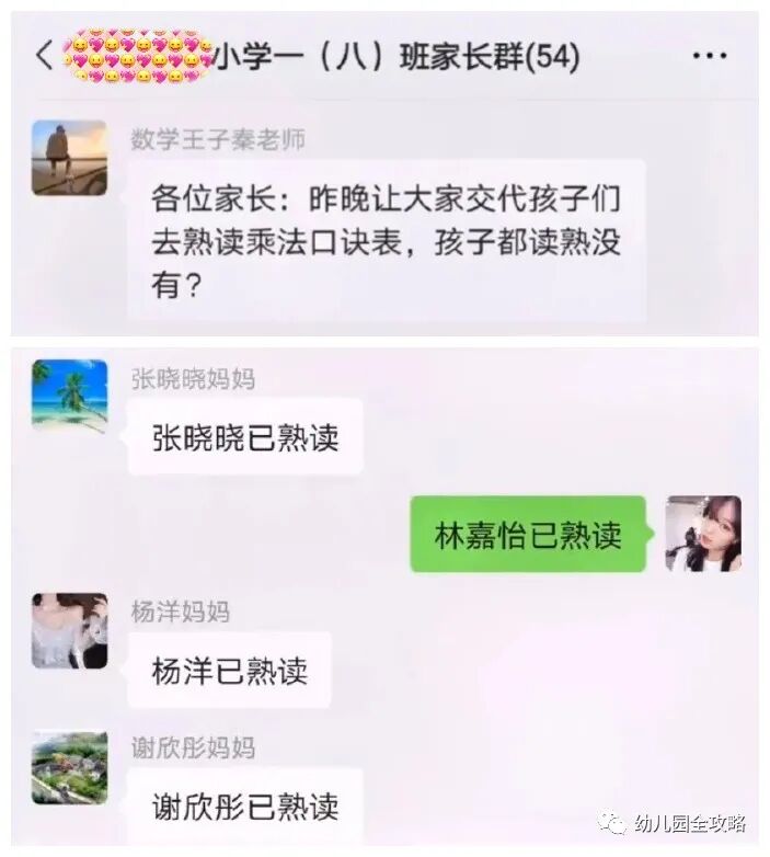 这次老师在群里布置了熟读乘法口诀表的作业,通过家长群询问作业完成情况。