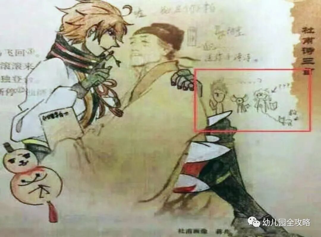 没想到一代诗圣在初中生的画笔下竟然成了一个“跳大绳”的,这二者之间的反差不可谓不大了。