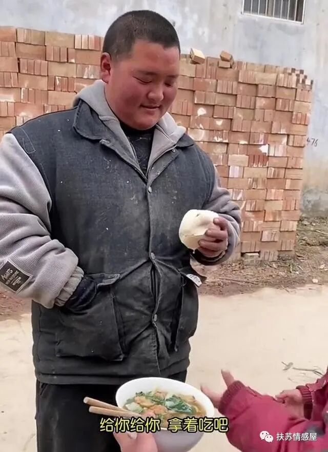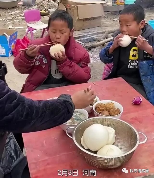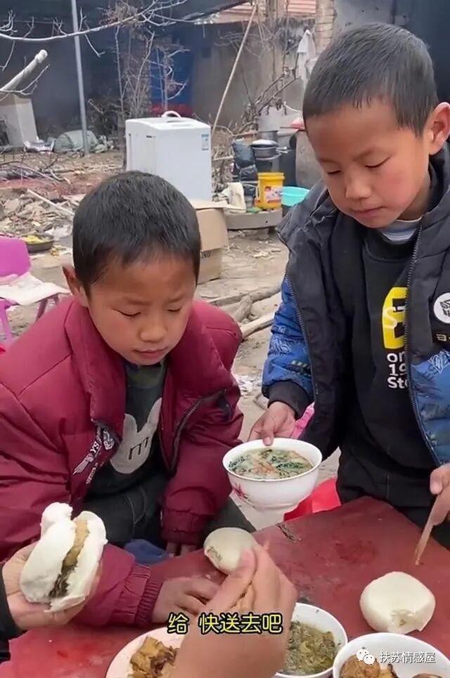 得到大人的许可,两个娃拿着食物一路小跑,来到男孩的面前,将馍和肉汤递给他说吃吧,如果不够我们俩再进去给你拿。