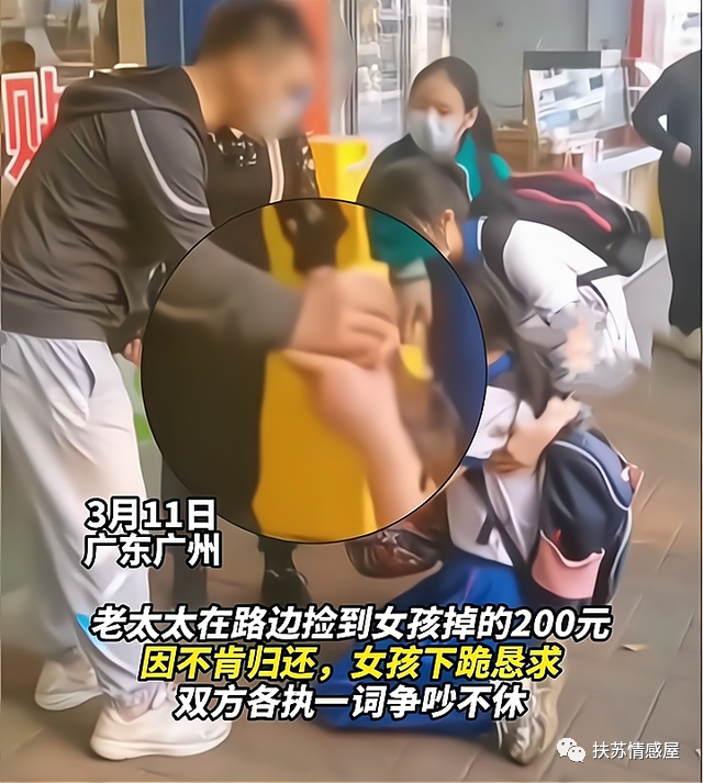 近日,广州街头,有一名老太太捡到200元不愿归还还,女生跪在地上苦苦哀求,说这个钱我是有用的,希望你能够还给我。