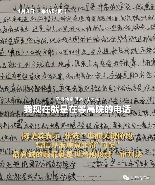 从张波的来信可以看到,字字句句都在表示忏悔,称自己两年多以来都没有睡好觉,经常以泪洗面,希望能够博得陈美霖的同情。