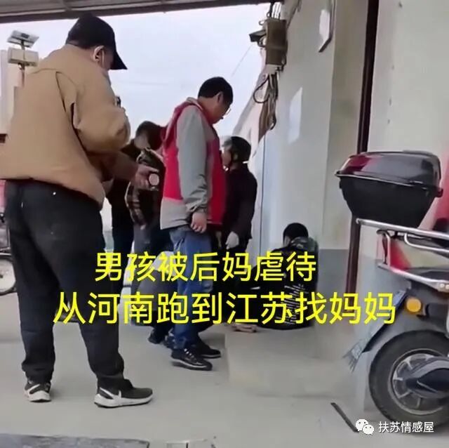 小男孩告诉好心人,我听爷爷奶奶说妈妈在江苏打工,后妈老是打我,我就想到江苏去找妈妈。